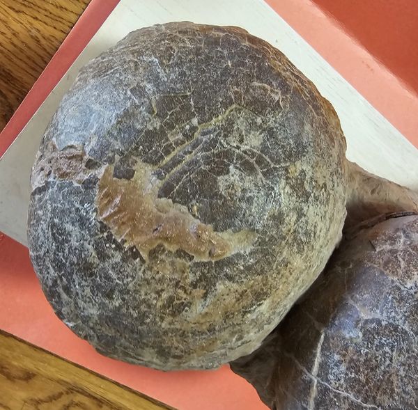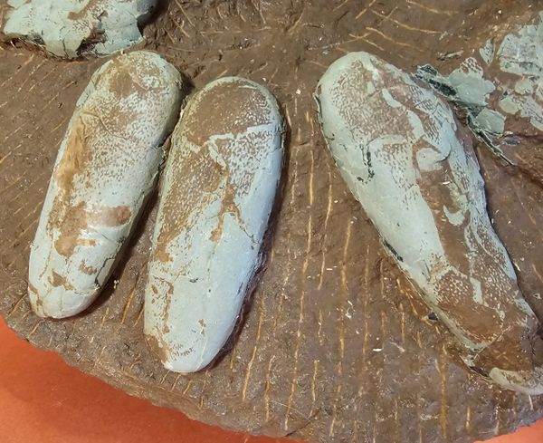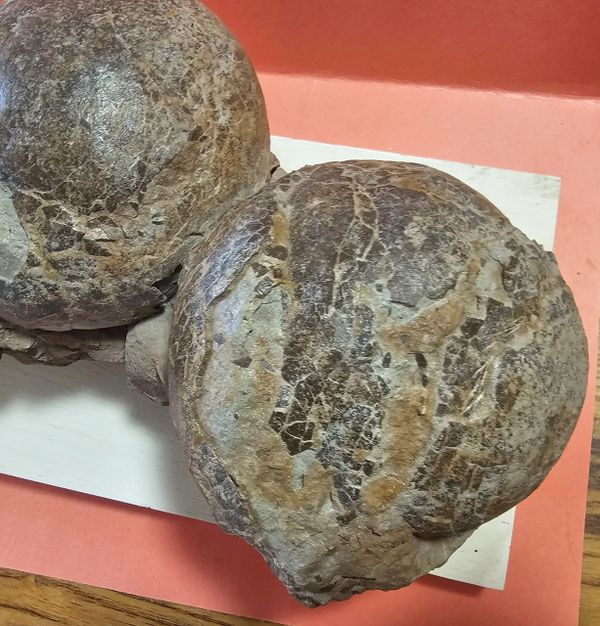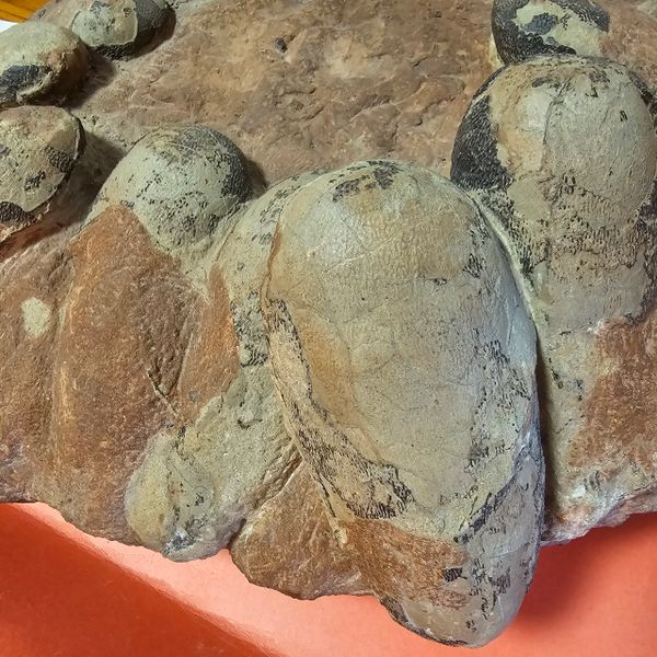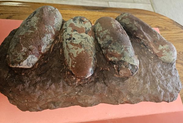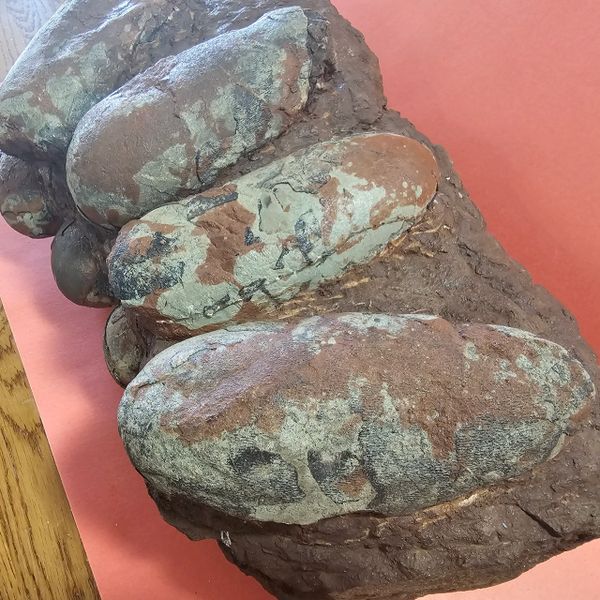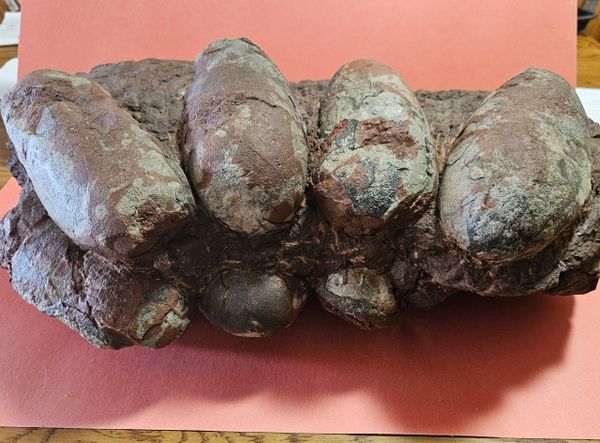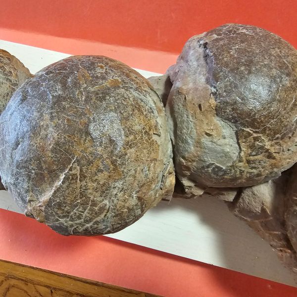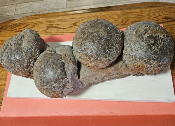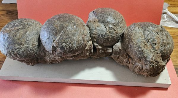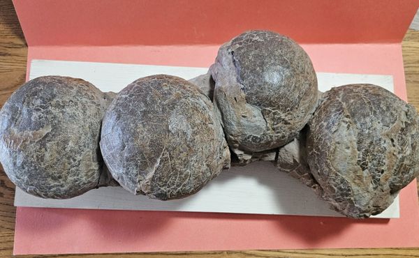 Fossil Dinosaur Raptor Egg Nest with 4 eggs. About 85% of the shell remains. Piece is apprx 20" long, Eggs are apprx 6" across. From the Cretaceous of Asia.