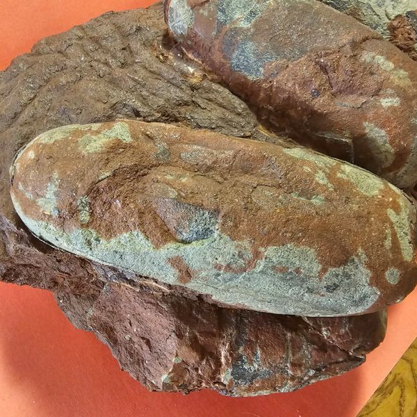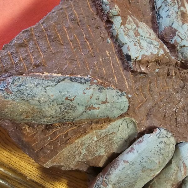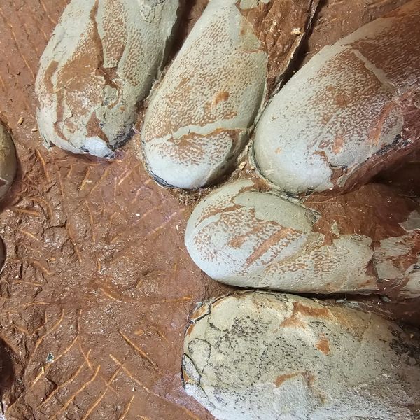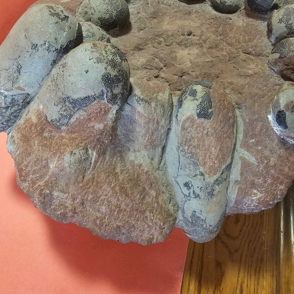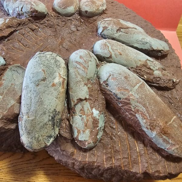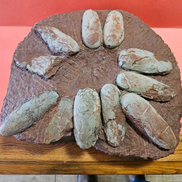 Fossil Dinosaur Raptor Egg Nest with 10 eggs. About 85% of the shell remains. Not sure what species of raptor it was. Piece is apprx 17" X 15" Eggs are apprx 6" long. As you can see, there is a cvouple of eggs that are not complete, and one empty spot where on fell out. From the Cretaceous of Asia.