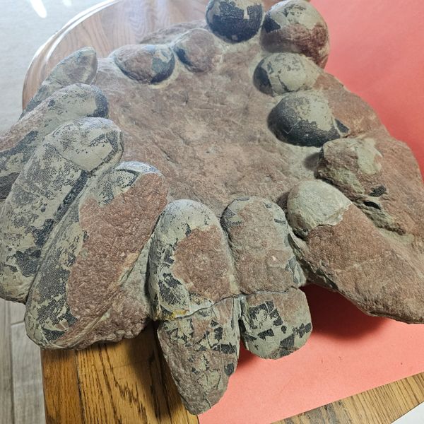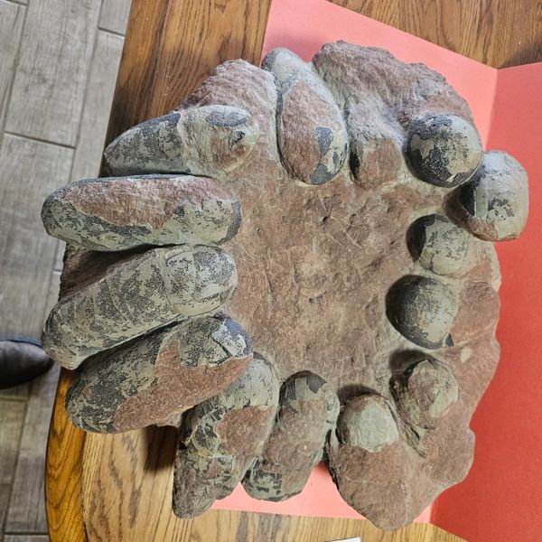 Fossil Dinosaur Raptor Egg Nest with 14 eggs. About 50% or better of the shell remains. Not sure what species of raptor it was. Piece is apprx 18" X 18" and real heavy. Eggs are apprx 5 1/2" to 6 1/2" long. From the Cretaceous of Asia