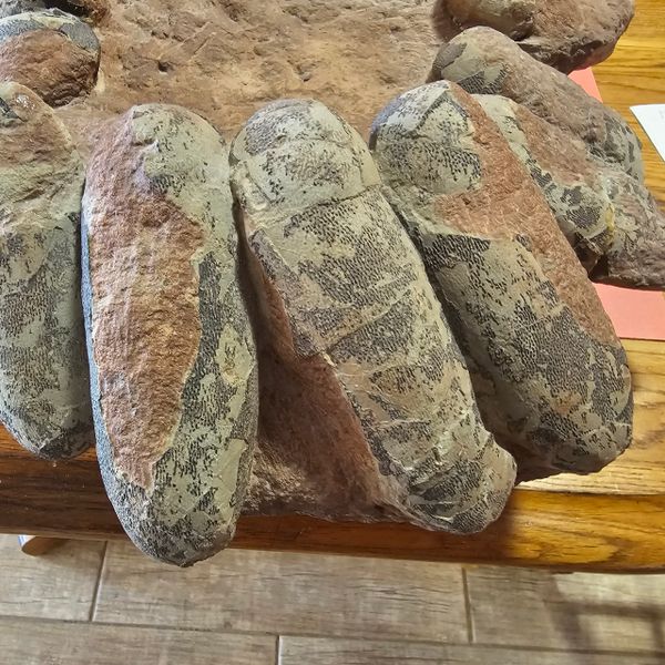 Fossil Dinosaur Raptor Egg Nest with 7 eggs. About 65% of the shell remains. Not sure what species of raptor it was. Piece is apprx 18" X 10" Eggs are apprx 7" - 7 1/2" long. From the Cretaceous of Asia.